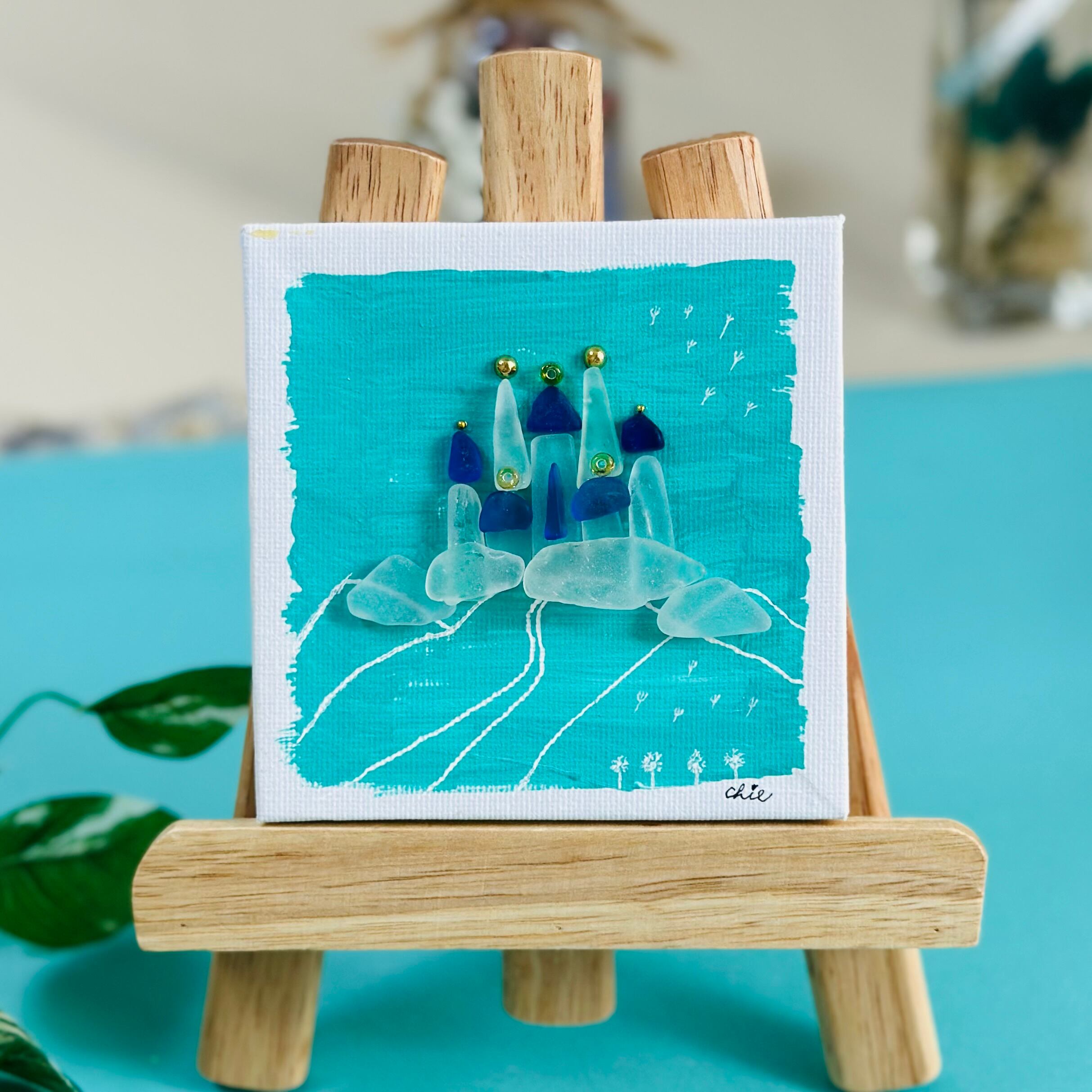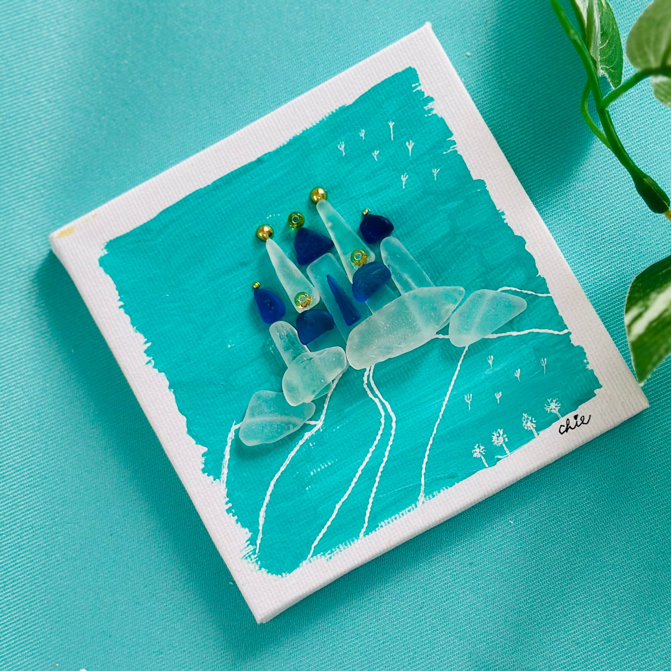 シーグラスアート no.68『お城』 インテリア ミニ額 キャンバスアート 壁掛け 置物 インテリア雑貨 贈り物 プチギフト キャンバス