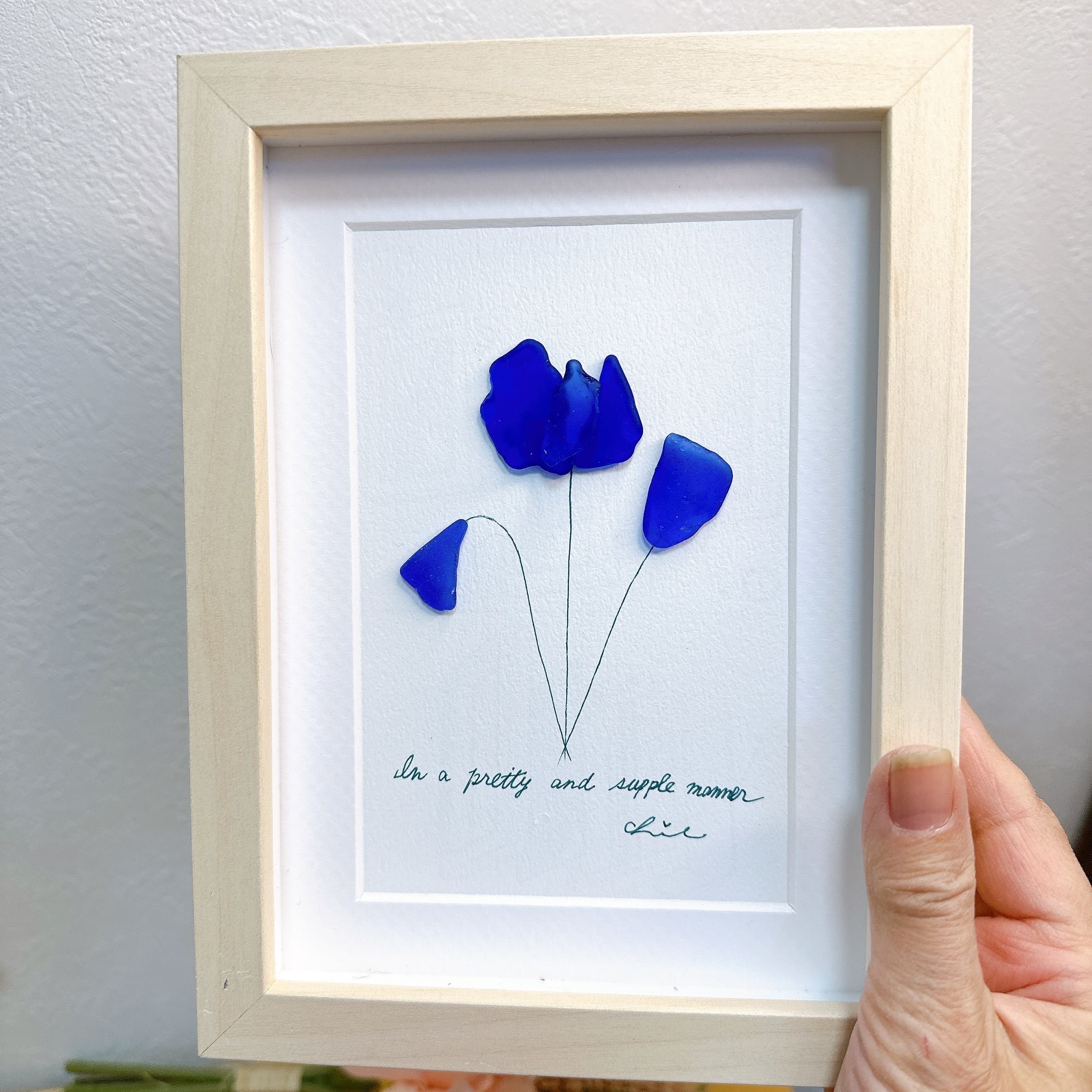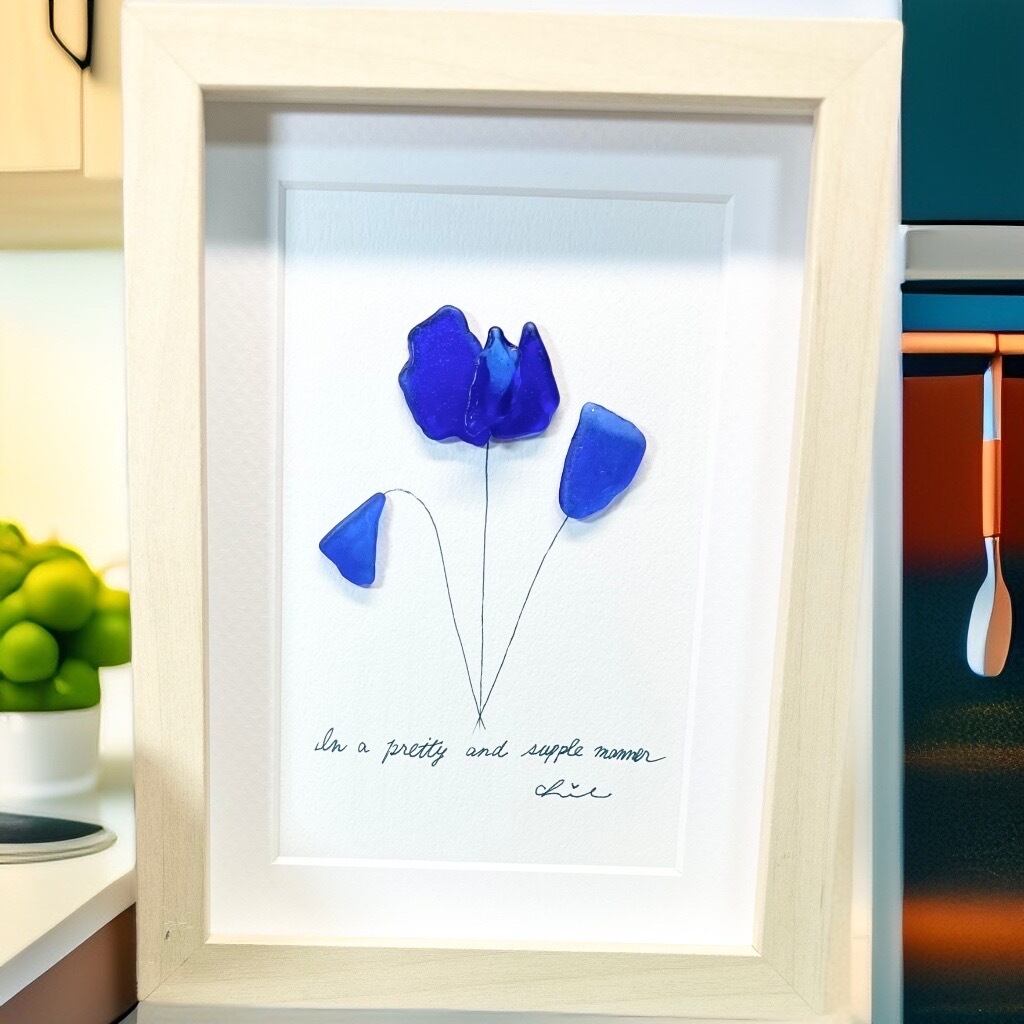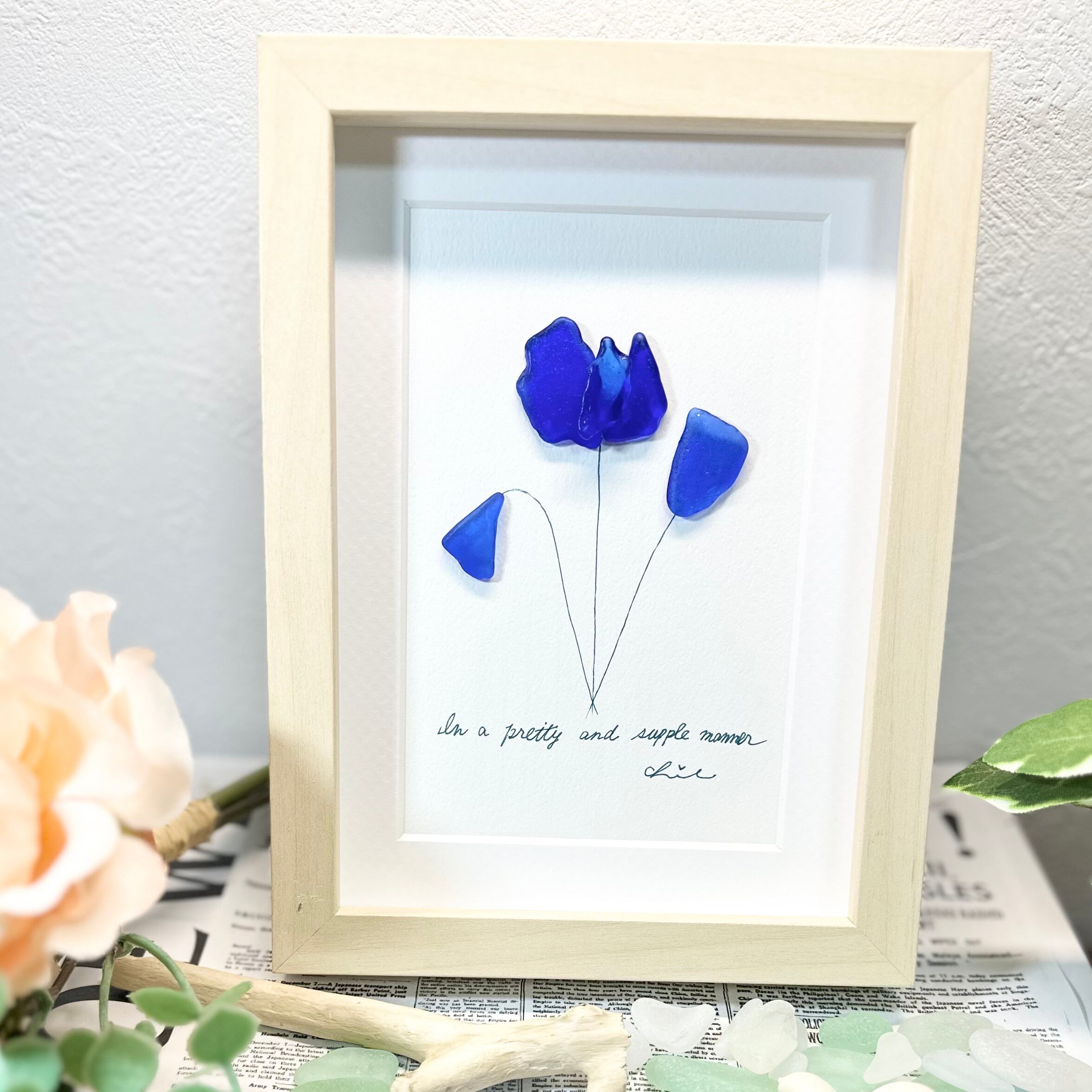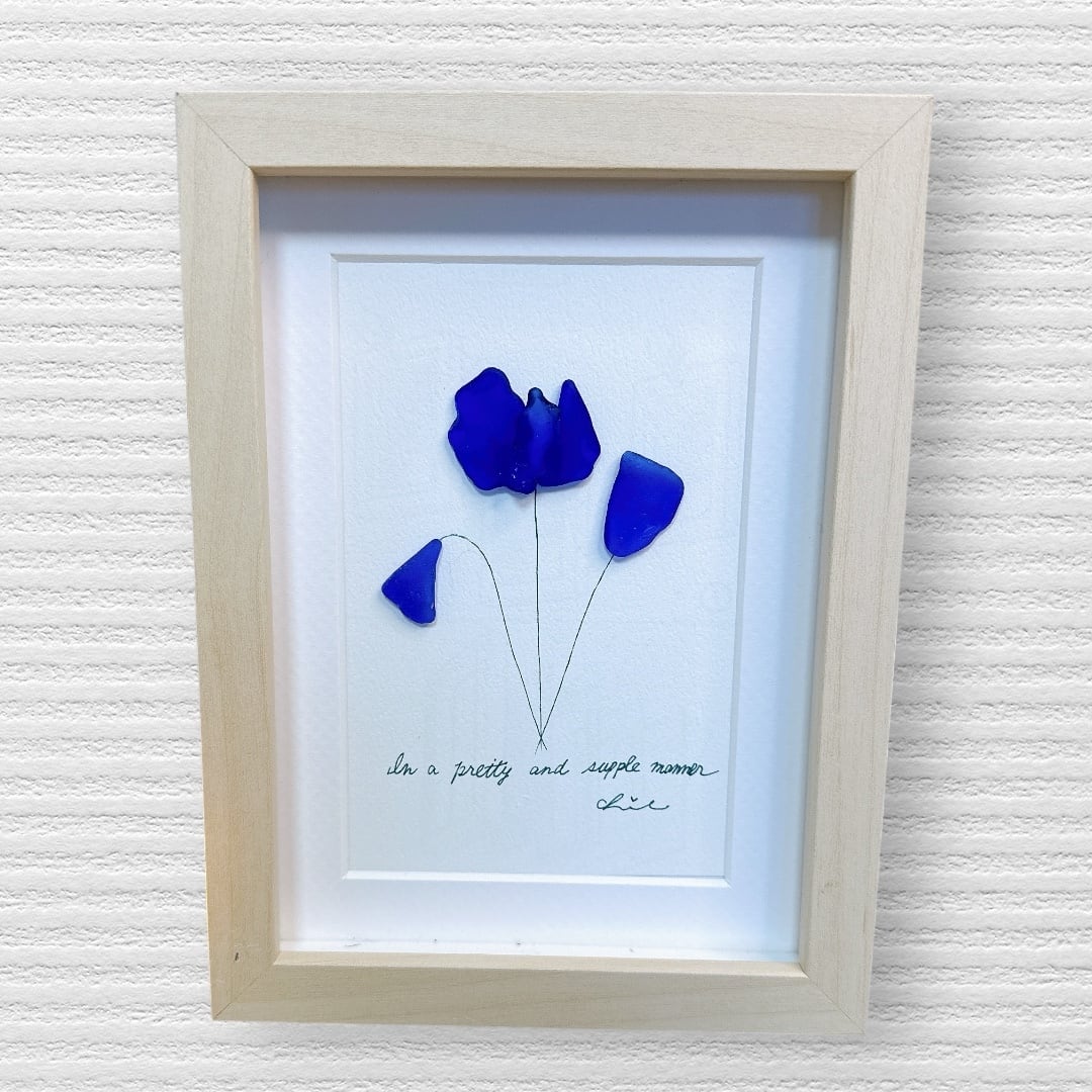 シーグラスアート 『ブルーフラワー青の世界②』は、コバルトブルーの美しい色合いが特徴のレアな花のアート作品です。
