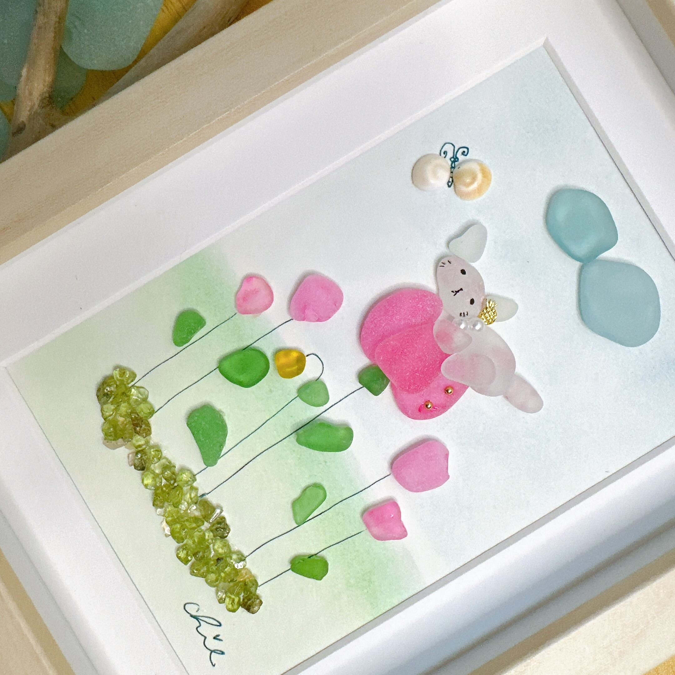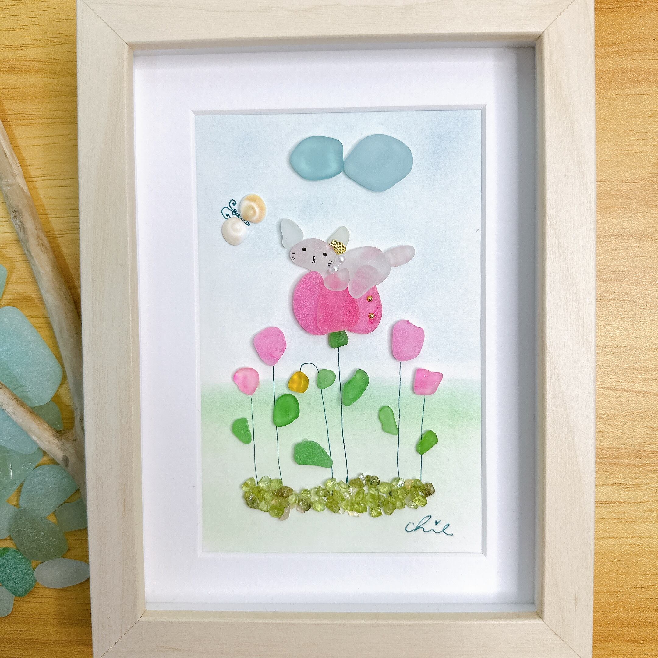 可愛らしいピンクの花と愛らしい猫ちゃん、さらに貝殻の蝶々が舞うこのシーグラスアート。