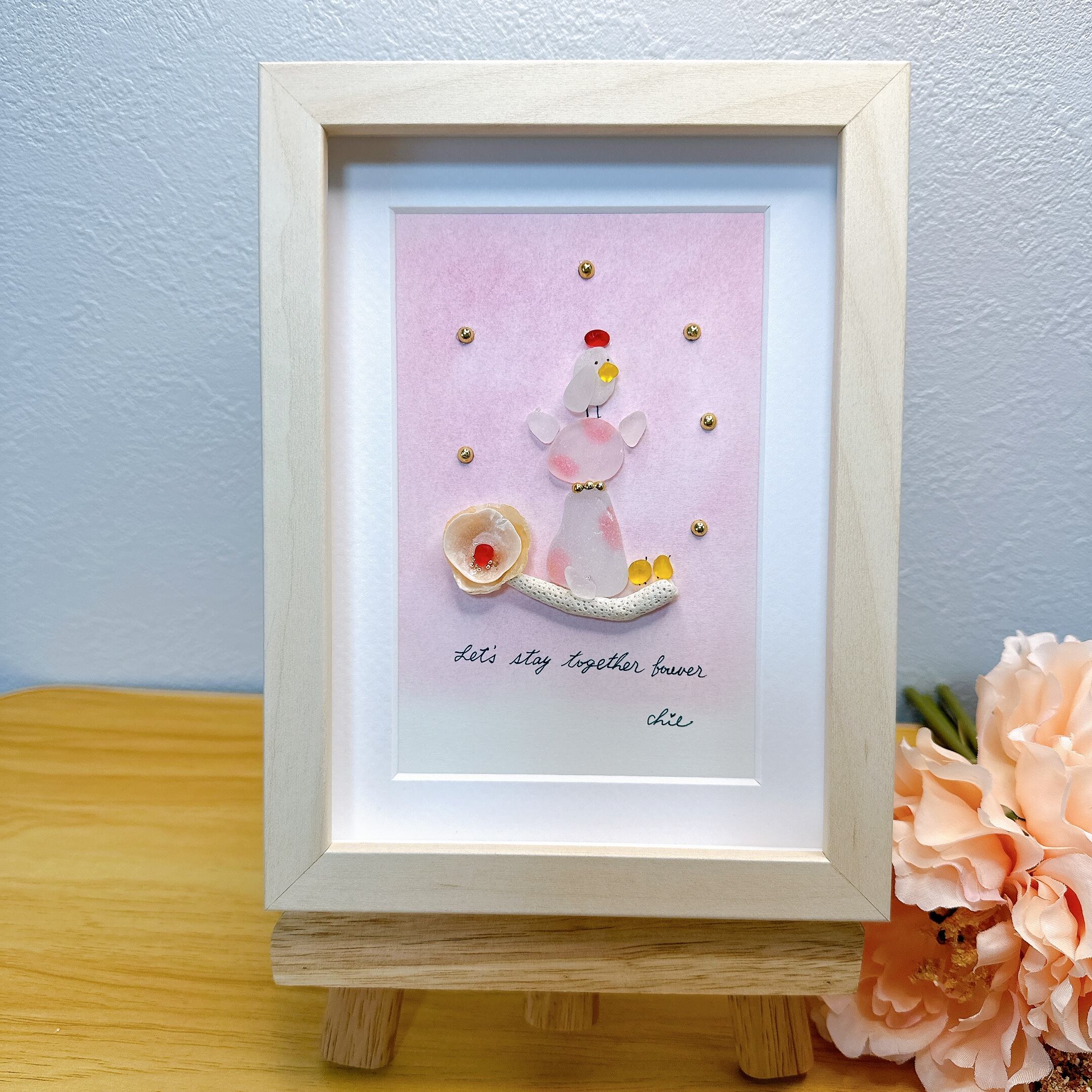 シーグラスアート no.33 猫ちゃんにちょこんとニワトリさん