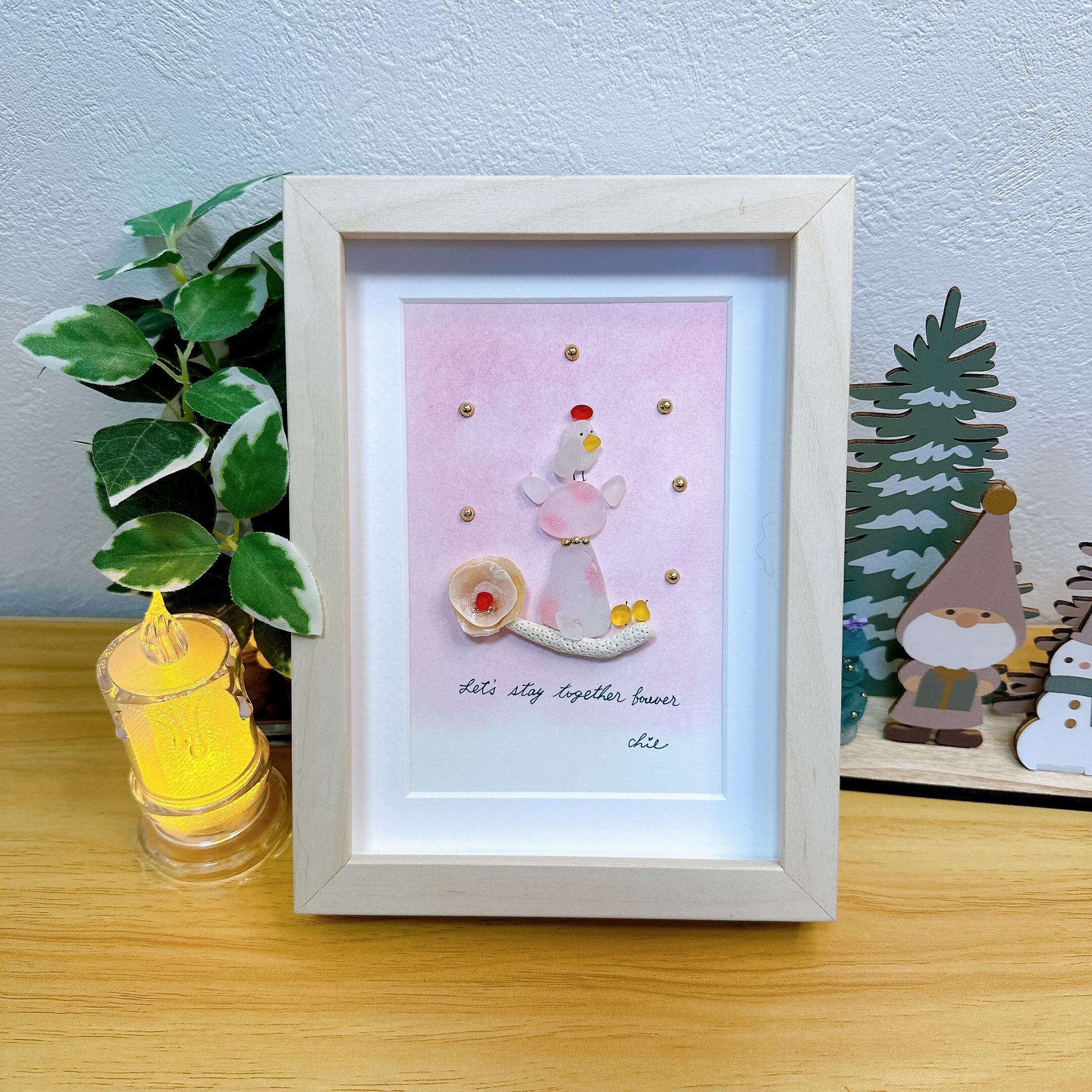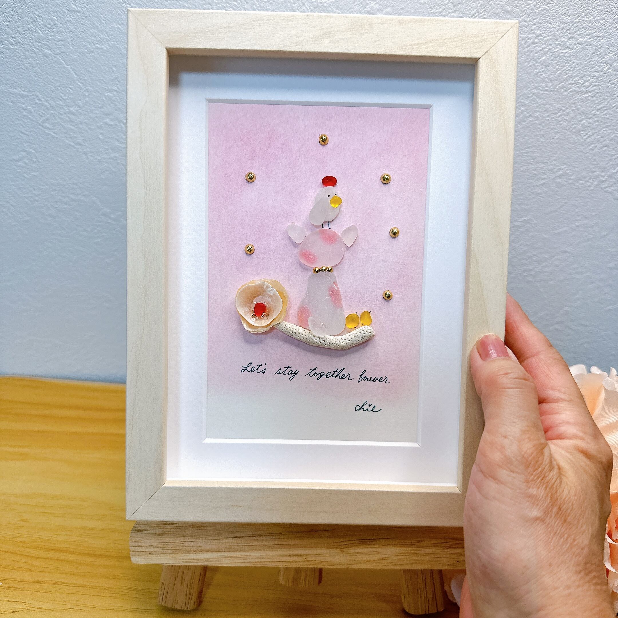 この作品は、シーグラスを使用して表現した『猫ちゃんにちょこんとニワトリさん』です。