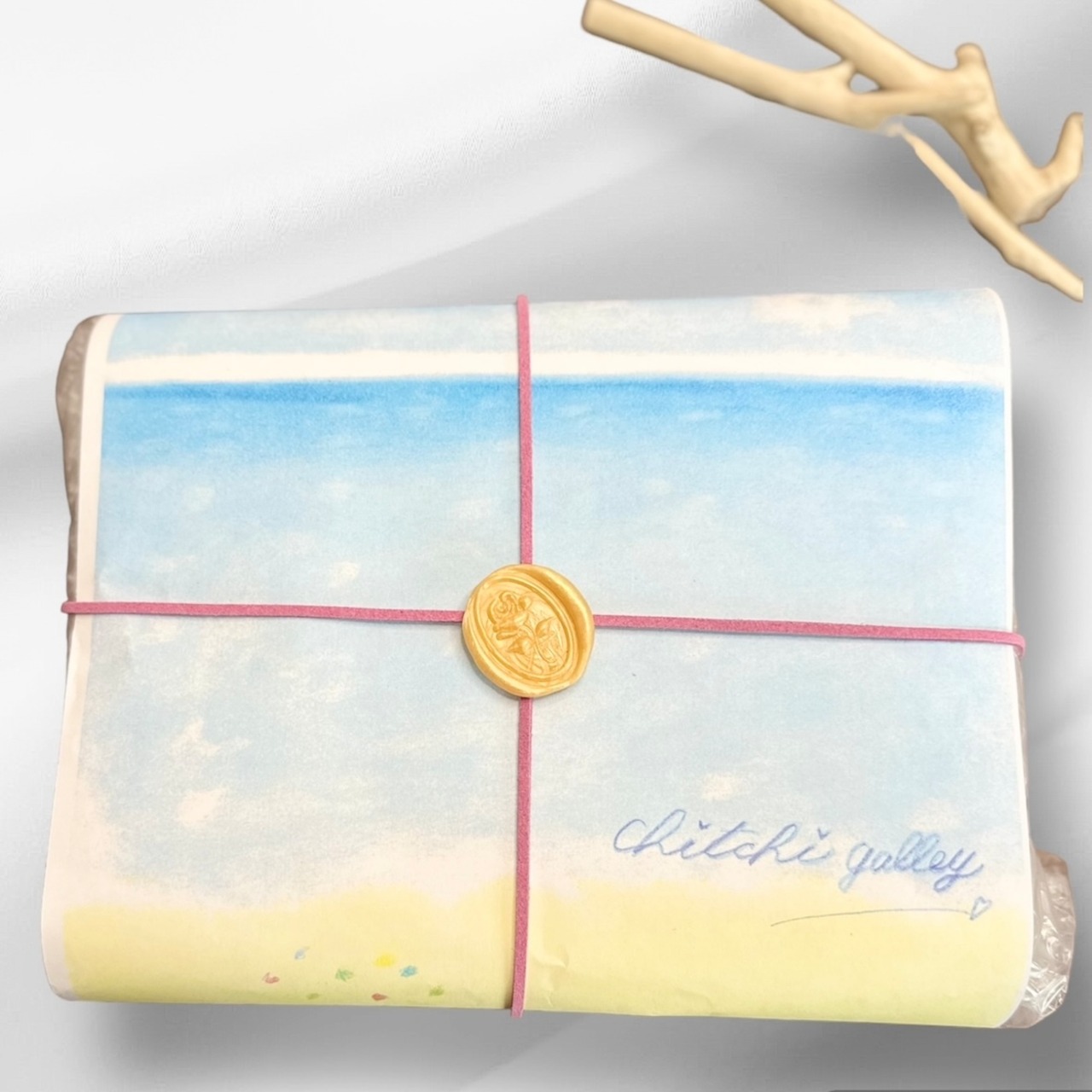 心を込めてお届けするため、自作の海の絵で包装紙を作成しました。愛情を込めた丁寧な梱包を心がけておりますので、安心してお受け取りください。