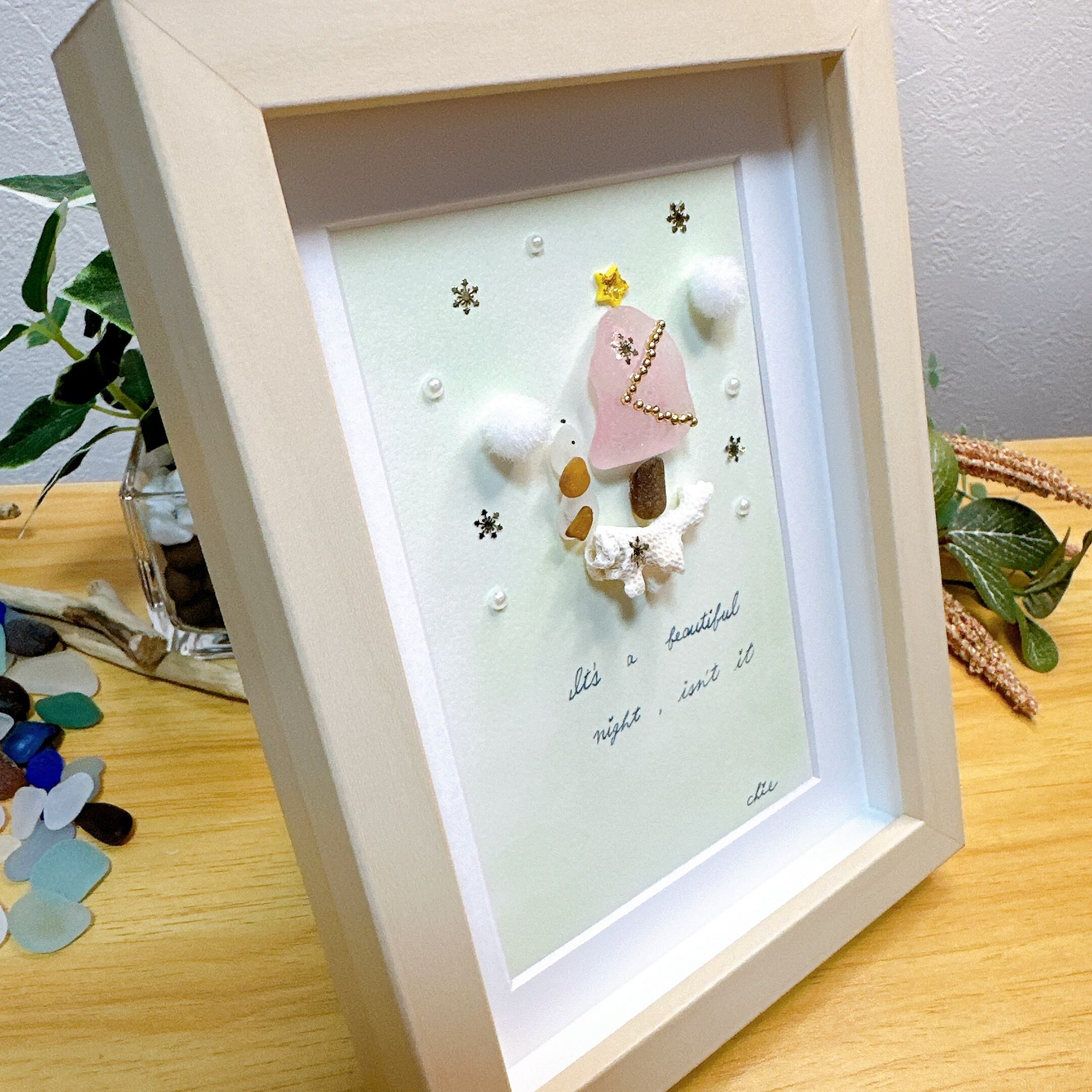 シーグラスアート 雪とツリーとワンちゃんと インテリア雑貨 クリスマス アート シーグラス