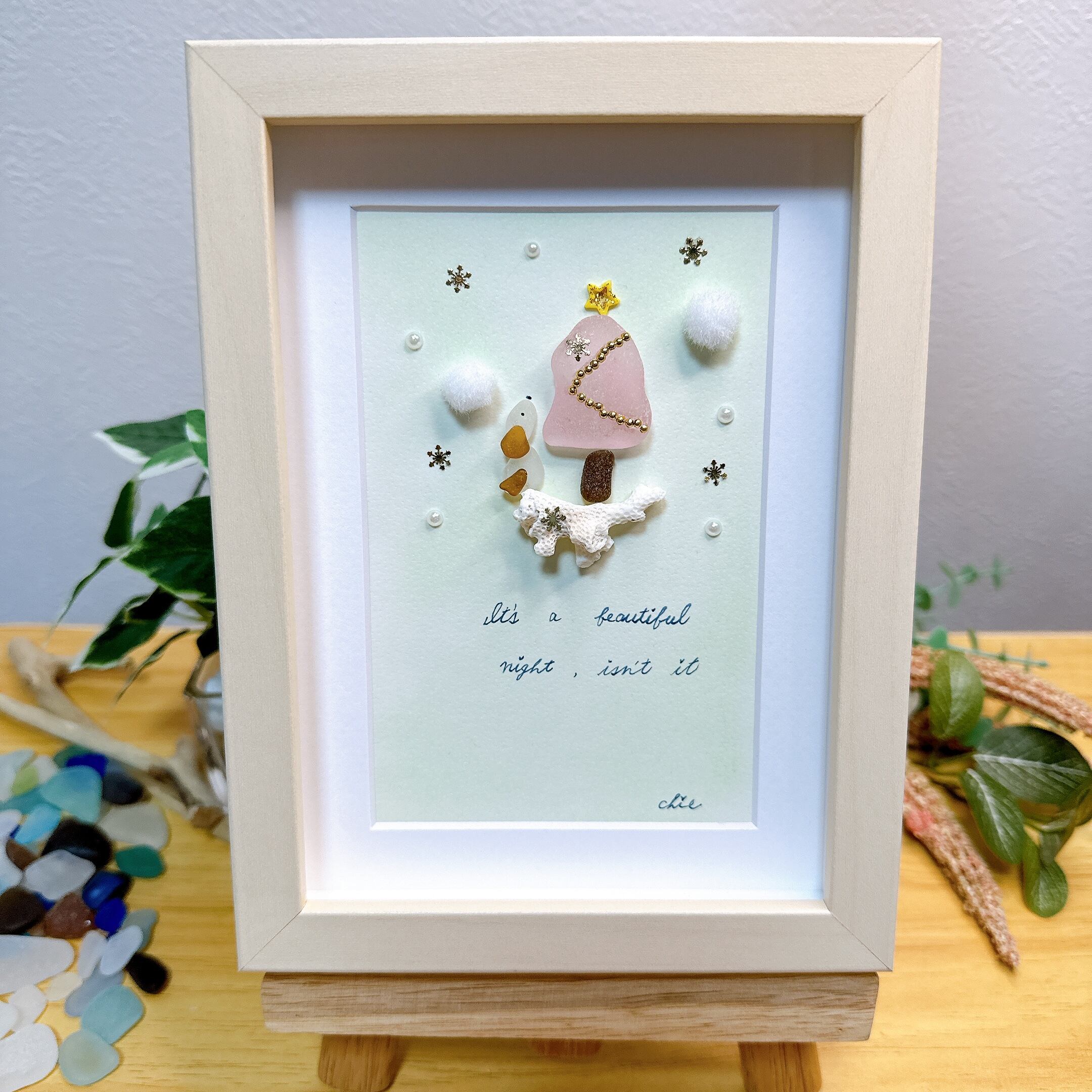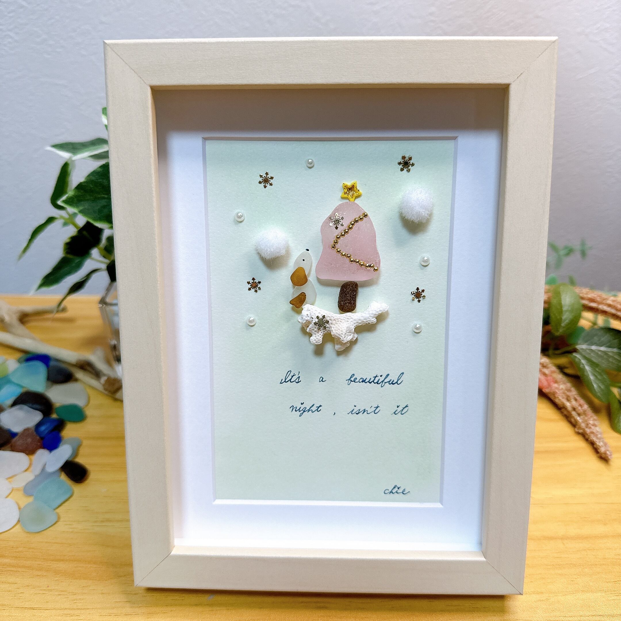 この作品は、シーグラスを使用して表現した『雪とツリーとワンちゃん』です。