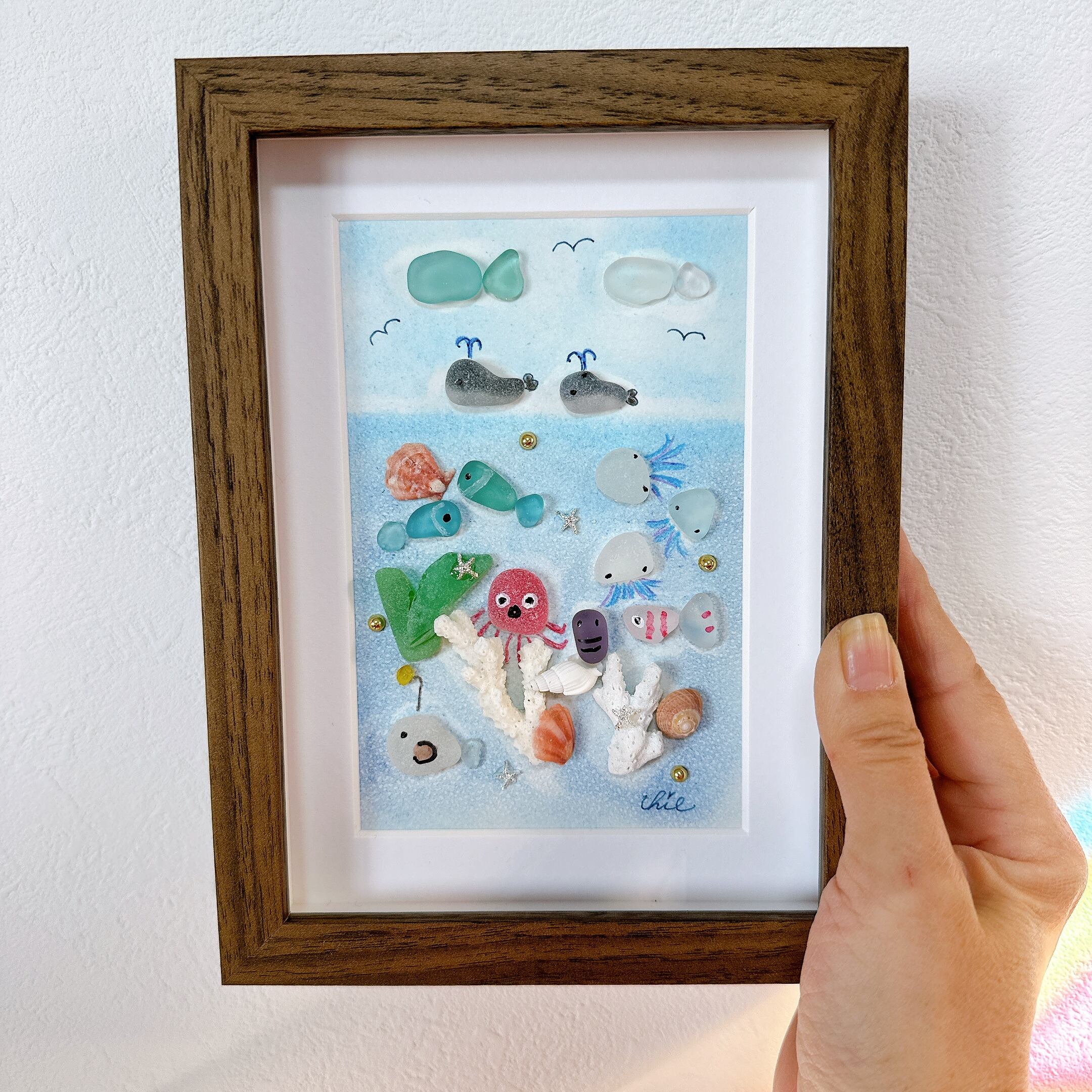 この作品は、可愛らしいタコやクラゲ、アンコをシーグラスで表現した『海の仲間たち』です。