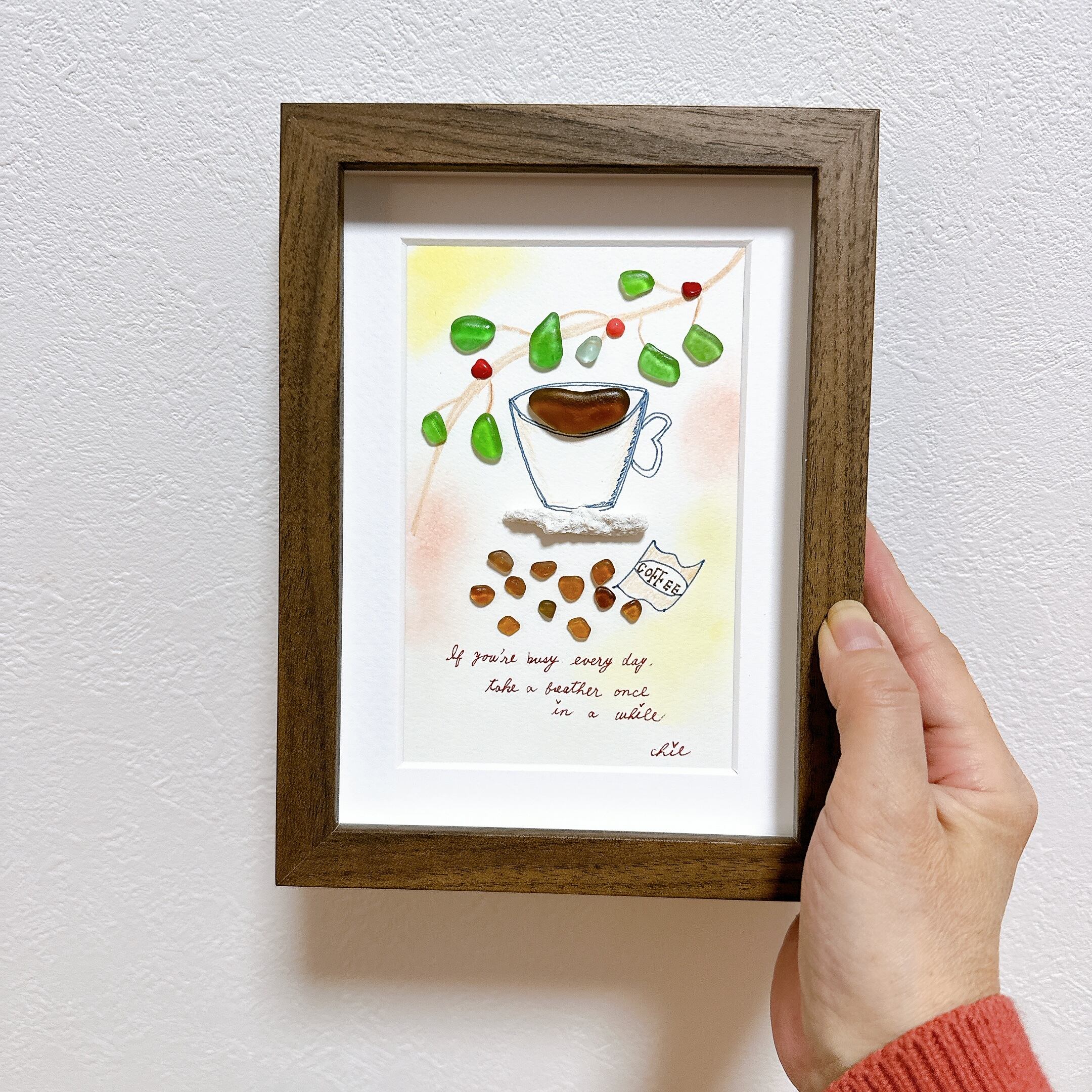 この作品は、温かいコーヒーを楽しむ瞬間をシーグラスで表現した『一息ついてね 』です。