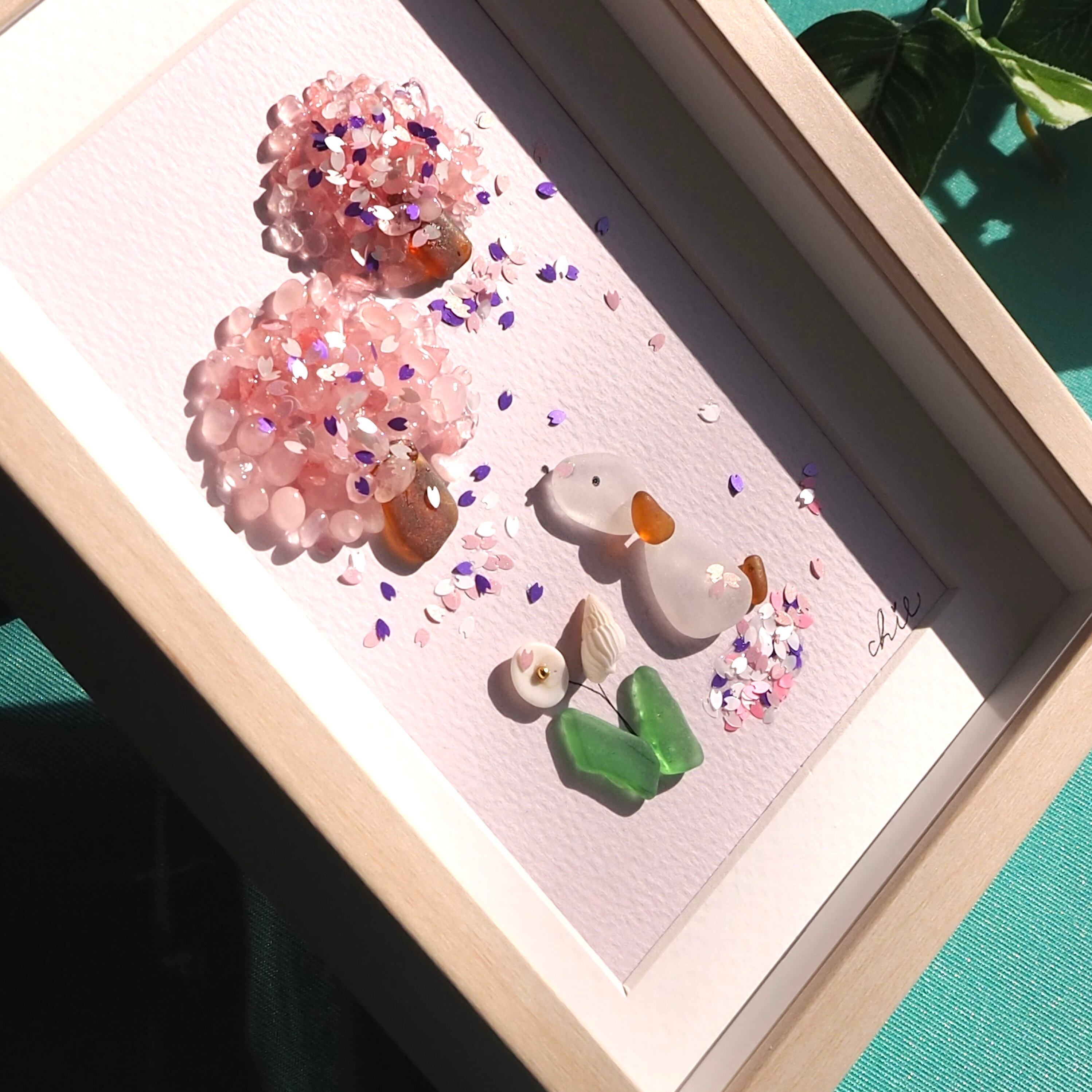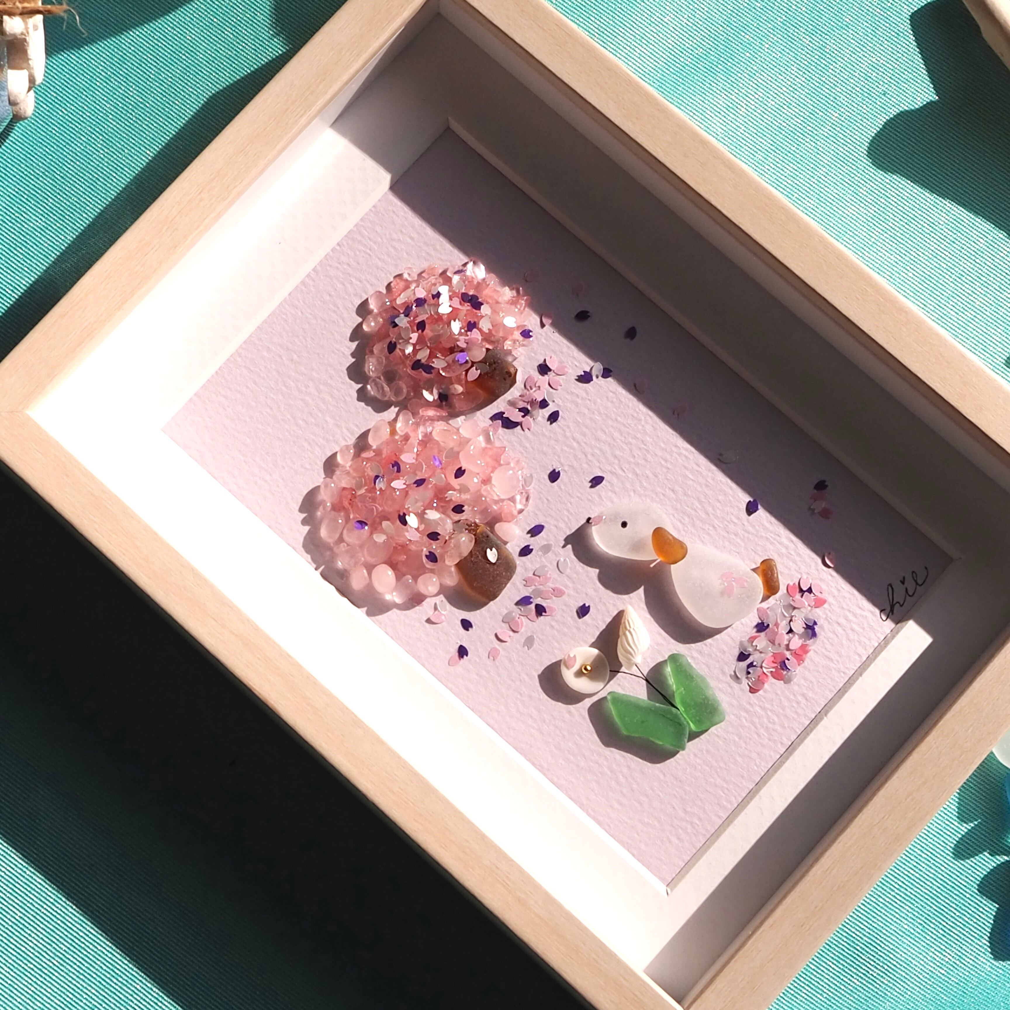 この作品は、愛らしいワンちゃんが桜の下で花見を楽しむ姿を描いたシーグラスアート『ワンちゃんのお花見』です。